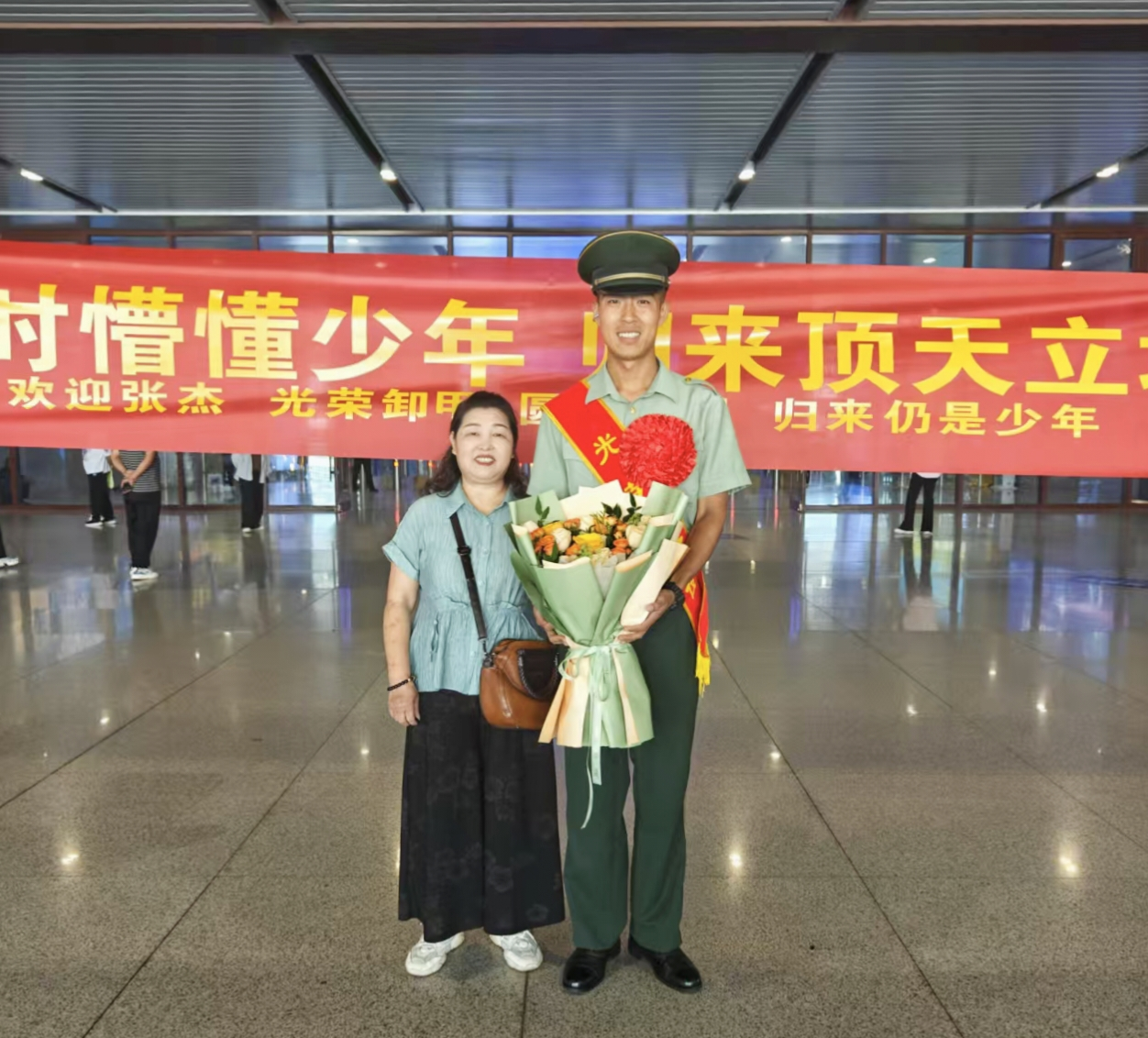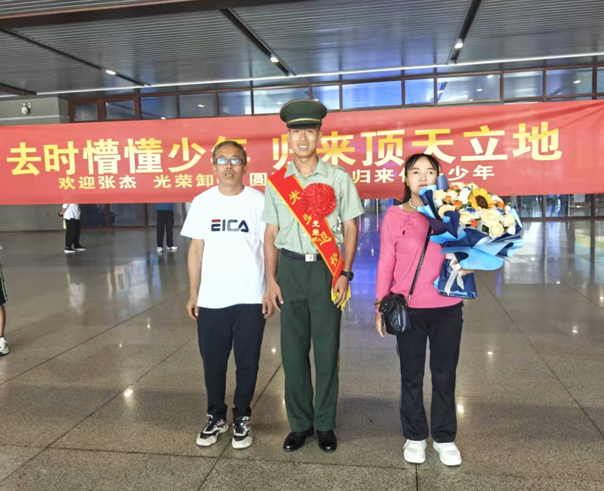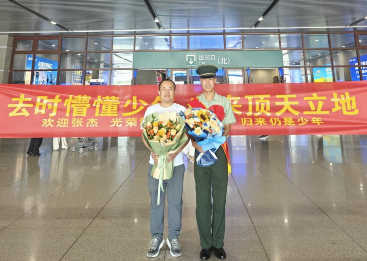 如今,张杰圆满归期,他带回的不仅是一身过硬的本领和坚韧的品质,更是一颗历经磨砺后更加炽热的爱国之心。他的眼神中多了一份沉稳与自信,曾经的稚嫩已被岁月打磨成担当的力量。回到家乡,他受到了亲朋好友的热烈欢迎,那条写着“去时懵懂少年,归来顶天立地”的横幅,是对他军旅生涯的最好褒奖,也是家乡人民对他的骄傲与期待 。