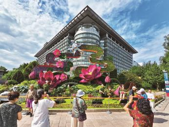 在金融街威斯汀大酒店东北角、菜市口东南角及什刹海荷花市场精心布置了3组以金凤呈祥、珍爱和平、运河之端为主题的立体花坛,依场地文化特质融入纪念元素,彰显“铭记历史、缅怀先烈、珍爱和平、开创未来”的总体理念。