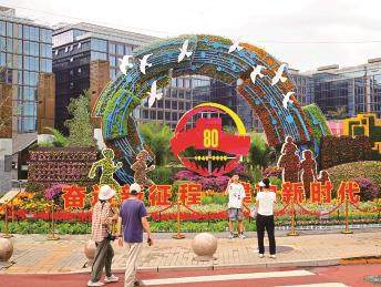 在月亮湾、荷花市场、平安大街地铁口等人流密集的城市街角,采用月季、美人蕉、凤仙、鸡冠花明黄、朱红色系的传统花卉,营造与老城风貌相得益彰的人文景观。一砖一花一木,展现京味京韵,更烘托出庄重热烈的纪念氛围。