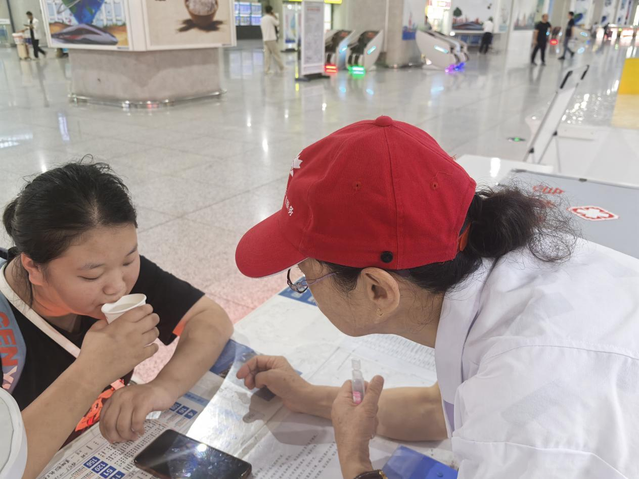“阿姨……我头晕,有点不舒服。刚才坐高铁下扶梯的时候,眼前一下子就黑了,站不住,还摔倒在地上。不过好像没摔伤。”9月4日上午十点半左右,说话间这位豆蔻年华的女中学生,脸色发白,额角还带着点薄汗,声音轻轻的有点颤。医疗岗志愿者孙莲青赶紧起身扶住她,并递了一把椅子让她坐下