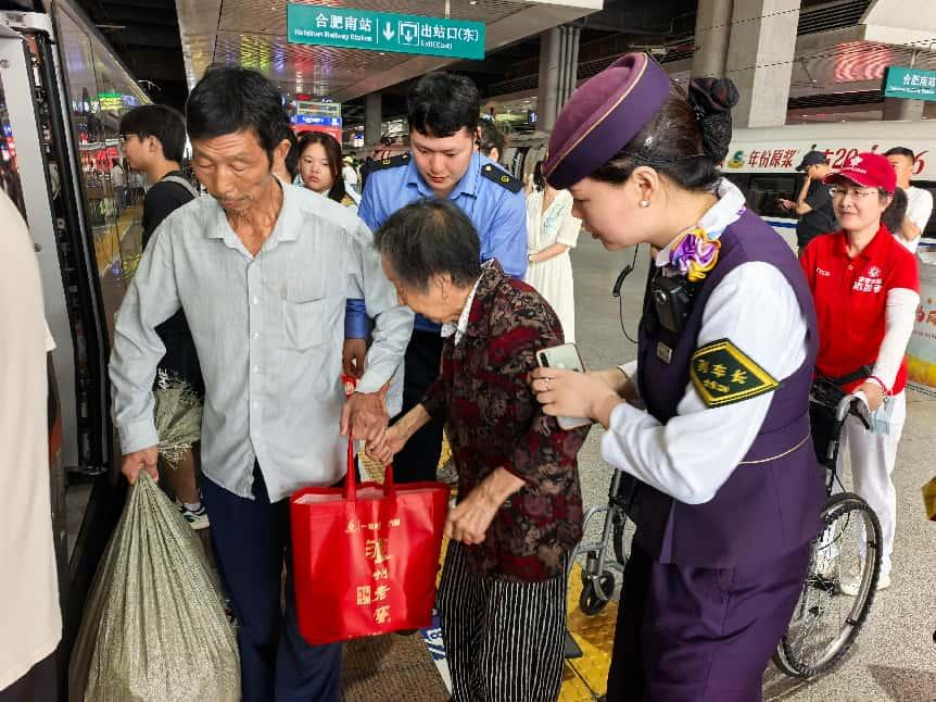 时间回溯到2025年8月24日中午,烈日当空,室外38°C的高温让人生畏。因手术未愈,腰间挂着尿壶的22岁小伙独自从浙江余姚返回肥东老家前,因行动不便提前拨通了“红枫爱心工作室”的预约电话。从志愿者提前小跑到站台下车点位,到列车长护送下车坐上轮椅,再通过无障碍电梯,取道到达厅出站安检口,再到网约车B区1号停车点,由另一名志愿者护送至网约车上,“就像陪着自家的孩子”。小伙向红枫志愿者笑着说并挥手道别。
