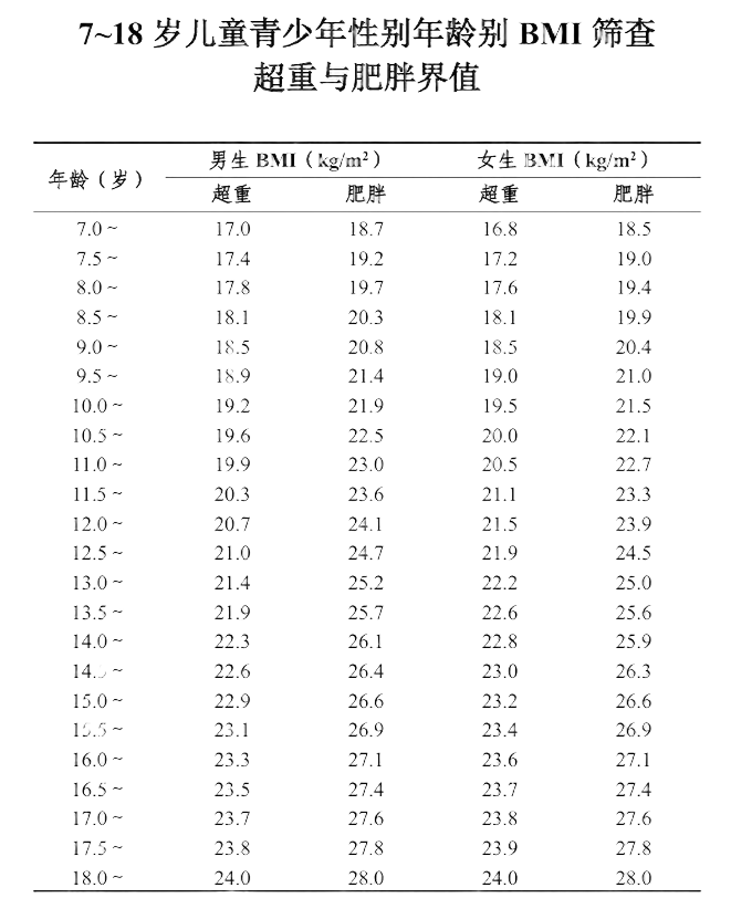 7~18岁儿童青少年以性别年龄别BMI作为筛查超重肥胖标准,家长可以借助对照表来帮孩子初步判断是否超重或肥胖。