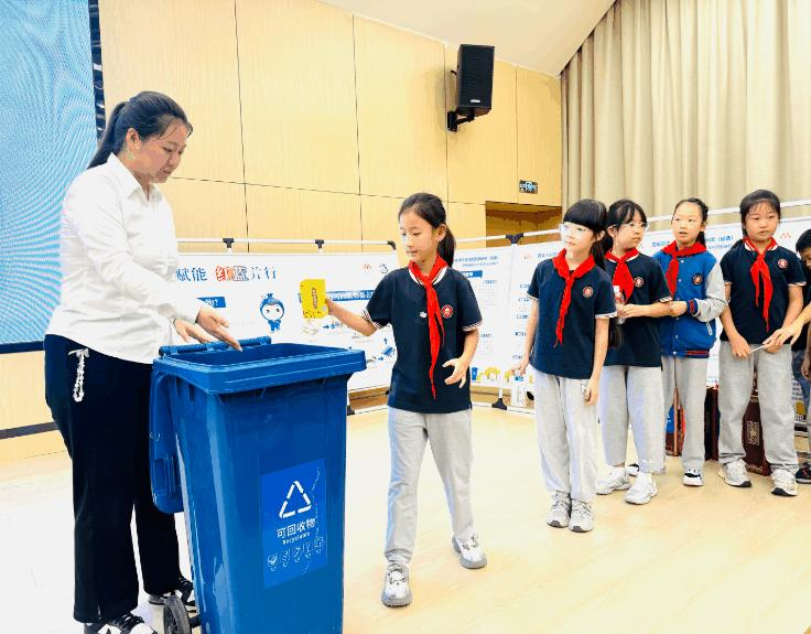 实操演练现场氛围热烈,工作人员现场设置了有害 垃圾、可回收物投放区,学生们携带家里搜集到的生活 垃圾积极参与“实战” 。从仔细辨认垃圾种类到精准投放 对应容器,工作人员全程提供指导,着重明确废泡沫塑 料等低值可回收物需投入蓝色垃圾桶、充电电池等有害垃圾需规范投放等关键要点,帮助学生快速掌握分类投 放技巧。