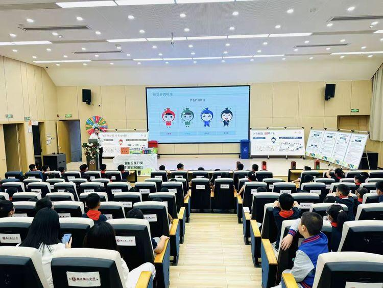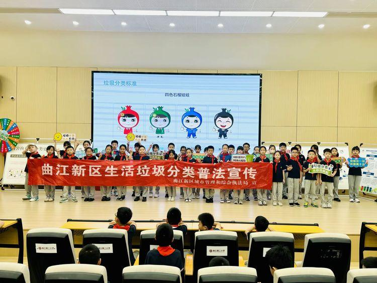 为持续夯实曲江新区生活垃圾分类工作基础,进一 步强化学生对有害垃圾与可回收物的分类认知,不断完 善垃圾分类投、收、运全链条管理,近日,曲江新区城市管理和综合执法局走进曲江第二小学,开展“分类赋 能 红蓝并行” 主题宣传教育活动。此次活动通过知识讲解、趣味互动、现场实操等环节,引导学生深化分类知 识储备、主动践行分类日常,让环保理念在寓教于乐的 氛围中扎根心底,以青春之力为校园添绿赋能。