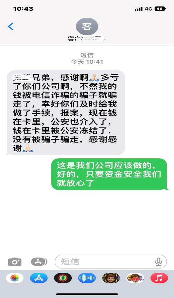 工作人员在听完客户描述后,立刻意识到这是一起典型的电信诈骗。她们迅速安抚客户情绪,详细询问了客户与诈骗分子的沟通细节,得知客户刚操作一笔保单借款,工作人员查询系统发现该笔借款还未到账,征得客户同意后立即对该笔交易进行暂停送划,同时工作人员协助客户拨打110报警并联系客户借款银行卡归属银行进行紧急挂失、冻结手续,对客户资金进行双重保护,在工作人员的全程协助下,客户成功避免了资金损失。事后客户对工作人员的专业和帮助表示感谢,
