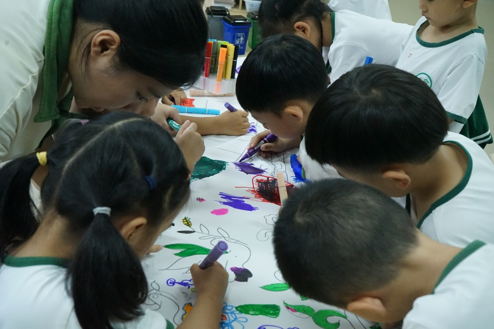 游戏结束后,工作人员明确了活动的核心任务——共同创作主题长卷画《绿色地球家园》。孩子们不仅要为画作上色,还要在创作过程中“送迷路的垃圾回家”。工作人员给出了分组建议并讲解了创作规则。9:50起,集体创作环节正式开始,轻快的背景音乐在教室内流淌,孩子们分组协作,充分发挥想象力和创造力,运用平涂、点彩、拓印等多种绘画技巧为长卷添色。教师则在现场巡回指导,及时提供帮助。创作过程中,孩子们学会了协商与分工,大胆用色的能力也得到了锻炼,更深刻体会到团队合作的重要性。