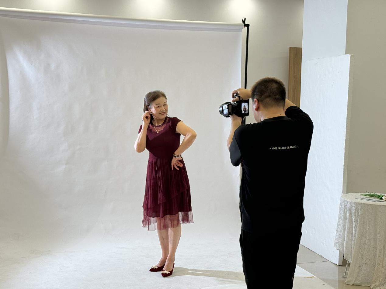 在活动现场,社区“变身”为一个充满爱与温馨的“摄影棚”。专业化妆老师耐心细致地为每一位老人精心挑选服装、打理发型、化上精致的妆容。摄影师更是巧妙引导,大家或相互依偎,或深情对望,或默契牵手,力求捕捉老人们最自然的瞬间。“我们那时候条件艰苦,结婚时就只有黑白合影,从来没穿过婚纱,今天总算圆梦了!”65岁的徐阿姨握着老伴的手,激动地表示。除了双人婚纱照,摄影师还为老人单独拍摄艺术照,他们穿着优雅的裙装以及帅气的西装,在镜头前展现出他们这个年龄独有的风采,随着相机快门声不断响起,一张张灿烂的笑脸和一个个幸福的时刻被瞬间定格。