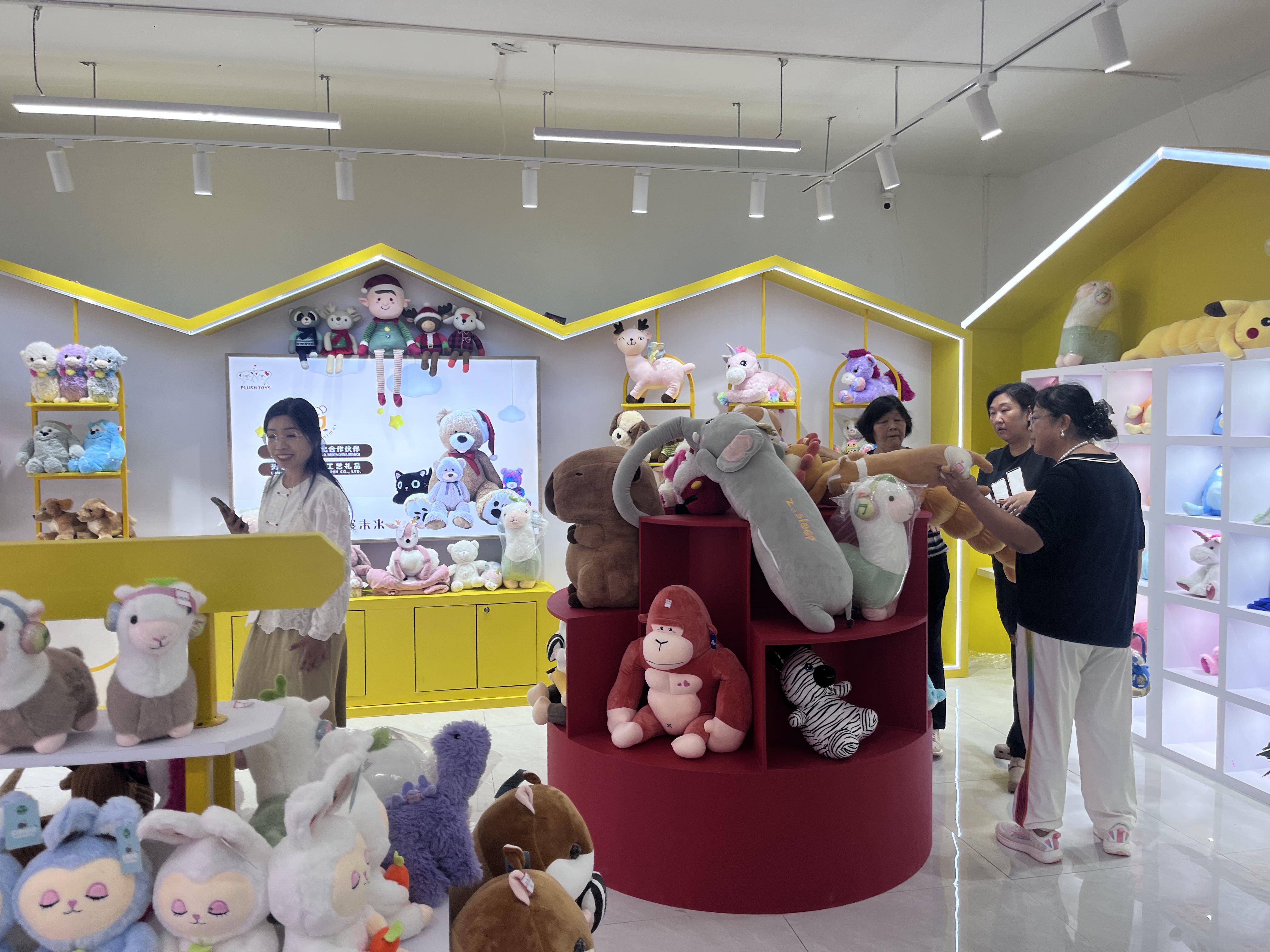 此外,该企业还集中展示了包括迪士尼系列、卡皮巴拉系列、care bear系列在内的多个知名IP授权产品,以及自主开发的各类毛绒玩具,总计超过200个品类。展品风格多样、受众广泛,从经典卡通形象到现代流行文化元素,充分体现了隆尧福顶在产品研发与市场响应方面的综合实力。