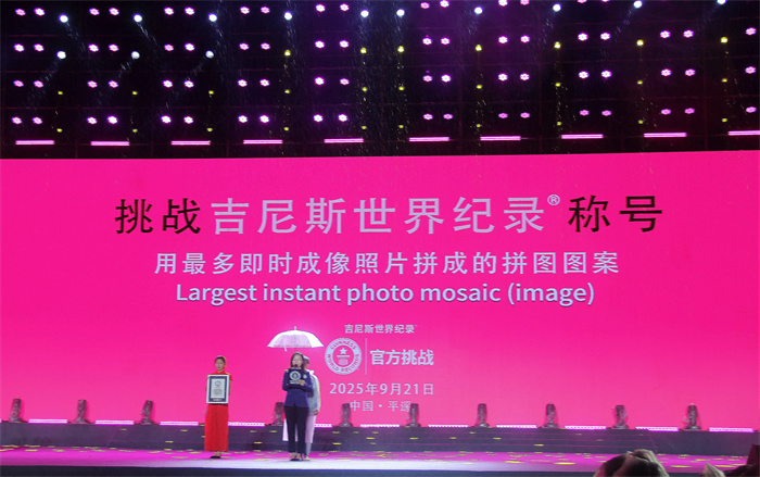 活动现场亮点纷呈。太原新晋商联盟文化发展有限公司赞助支持,大展组委会与艺术家张旭龙合作完成的“最大即时成像照片拼图”,由3096张宝丽来银盐胶片拼接而成,面积达25.847平方米,经吉尼斯世界纪录认证官Monica女士现场认证,正式刷新世界纪录。这幅宏大影像以“慢纪实”语言,在人工智能浪潮中引发人们对影像本质与时间意义的深度思考。