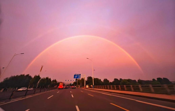 路边的人也慢慢停下脚步,有人举着手机拍照,有人牵着孩子抬头望着,而妈妈却对我说:“这么好看的彩虹,说不定能带来好运呢!”我不禁又往彩虹的方向多看了两眼,阳光透过云层洒在上面,泛着细碎的光。