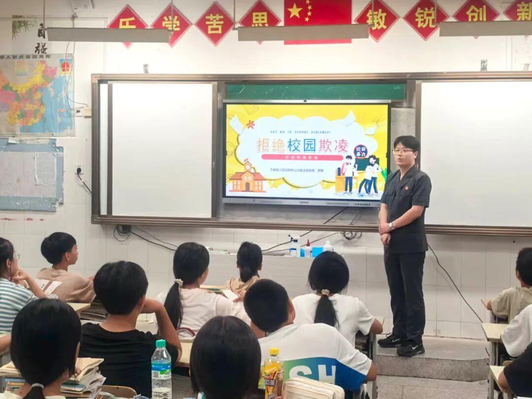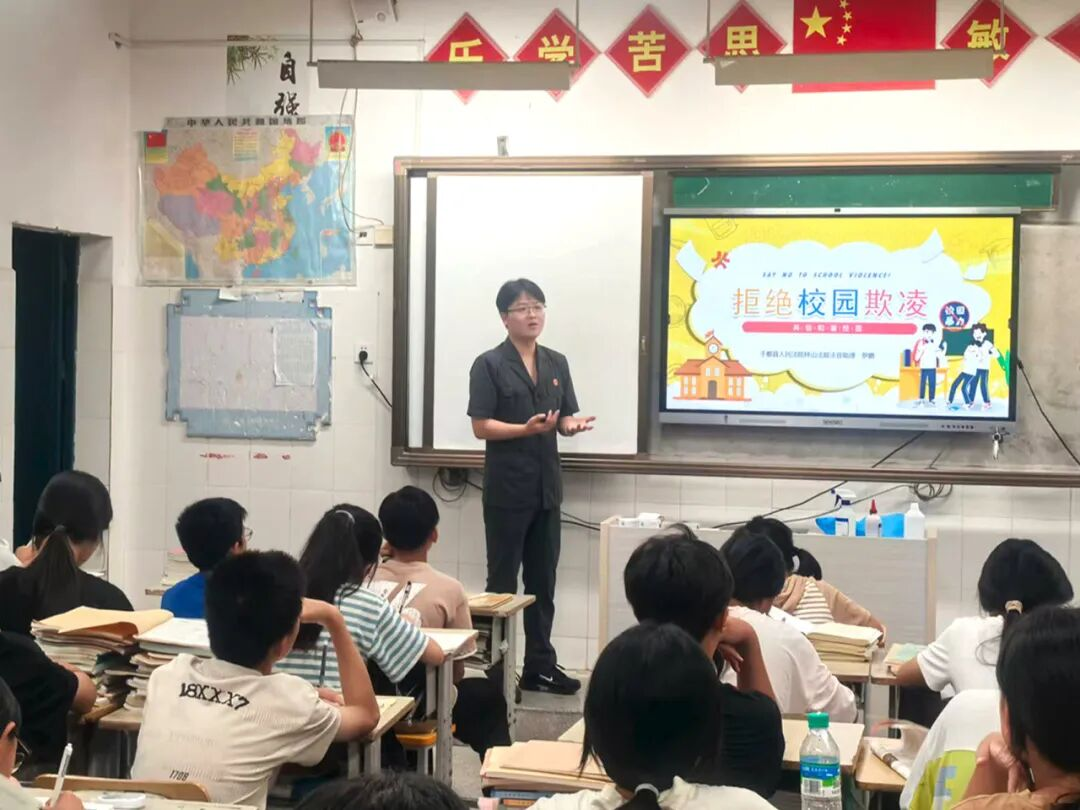 座谈交流后,法官助理罗鹏作为学校“法治辅导员”为雩山中小学固院校区学生们开展“拒绝校园欺凌”主题法治课。他结合不同学段学生身心特点和认知水平,用通俗易懂、寓教于乐的语言,通过“法律知识+典型案例”的形式,深入剖析校园欺凌、不良行为界定、未成年人犯罪等热点问题,教学生如何识别危险,如何应对不法侵害,引导学生遵纪守法,学会运用法律武器保护自己和他人的合法权益,坚决对校园欺凌说“不”。