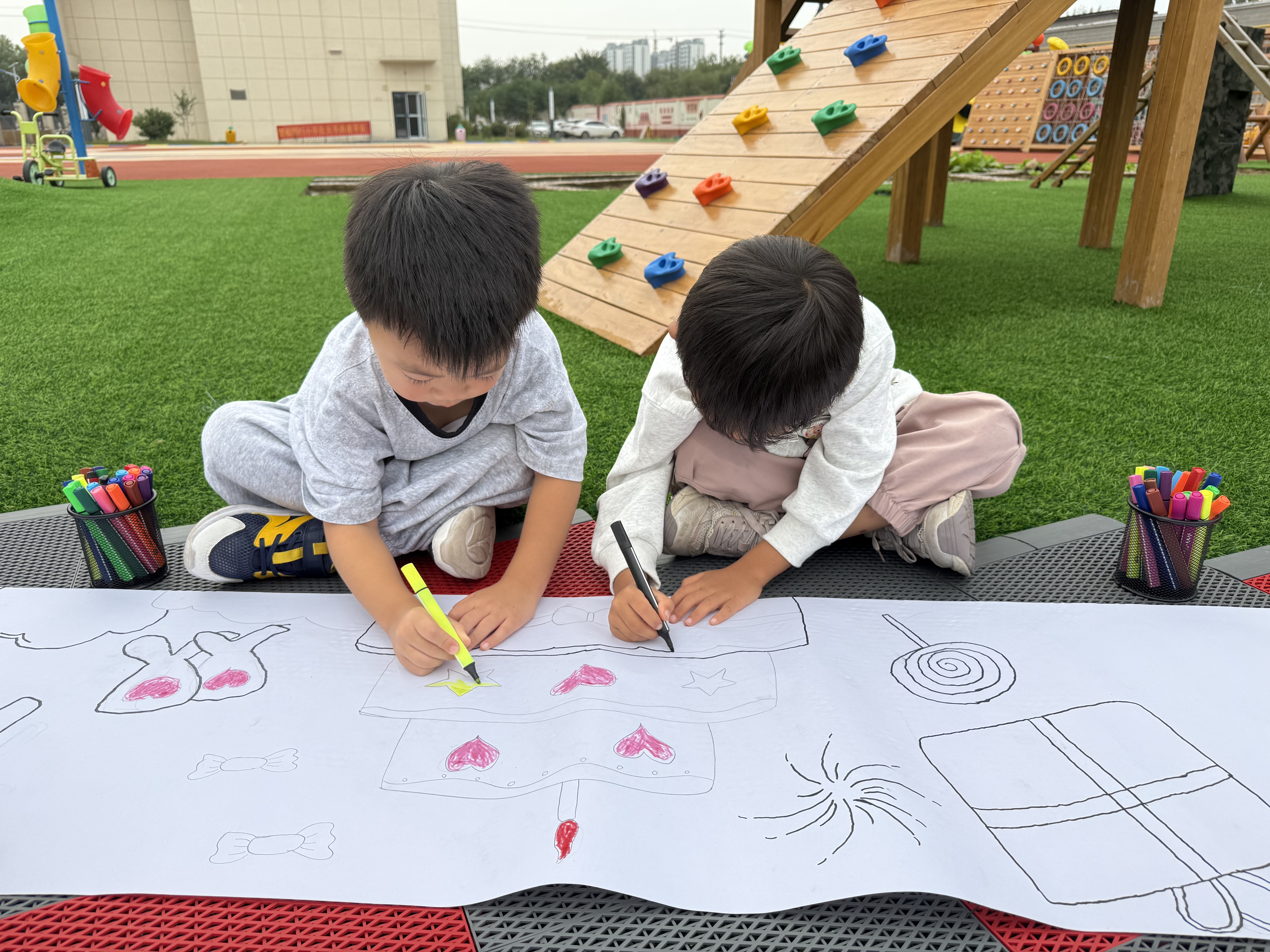 在“百米长卷绘中华”活动现场,孩子们化身“小小艺术家”,手持五彩画笔,或跪坐、或趴伏,用稚嫩笔触尽情挥洒创意。巍峨的天安门、鲜艳的五星红旗、腾飞的巨龙……一幅幅充满童趣的画面跃然纸上,凝聚着孩子们对祖国的美好祝福。传统中秋活动区,古色古香的灯笼下,老师们精心准备的灯谜涵盖诗词、成语等内容,既具知识性又富趣味性。幼儿园“食育坊”里,孩子们穿上围裙,在老师指导下学习揉面、包馅、压模,一个个造型精美、香气四溢的月饼新鲜出炉。