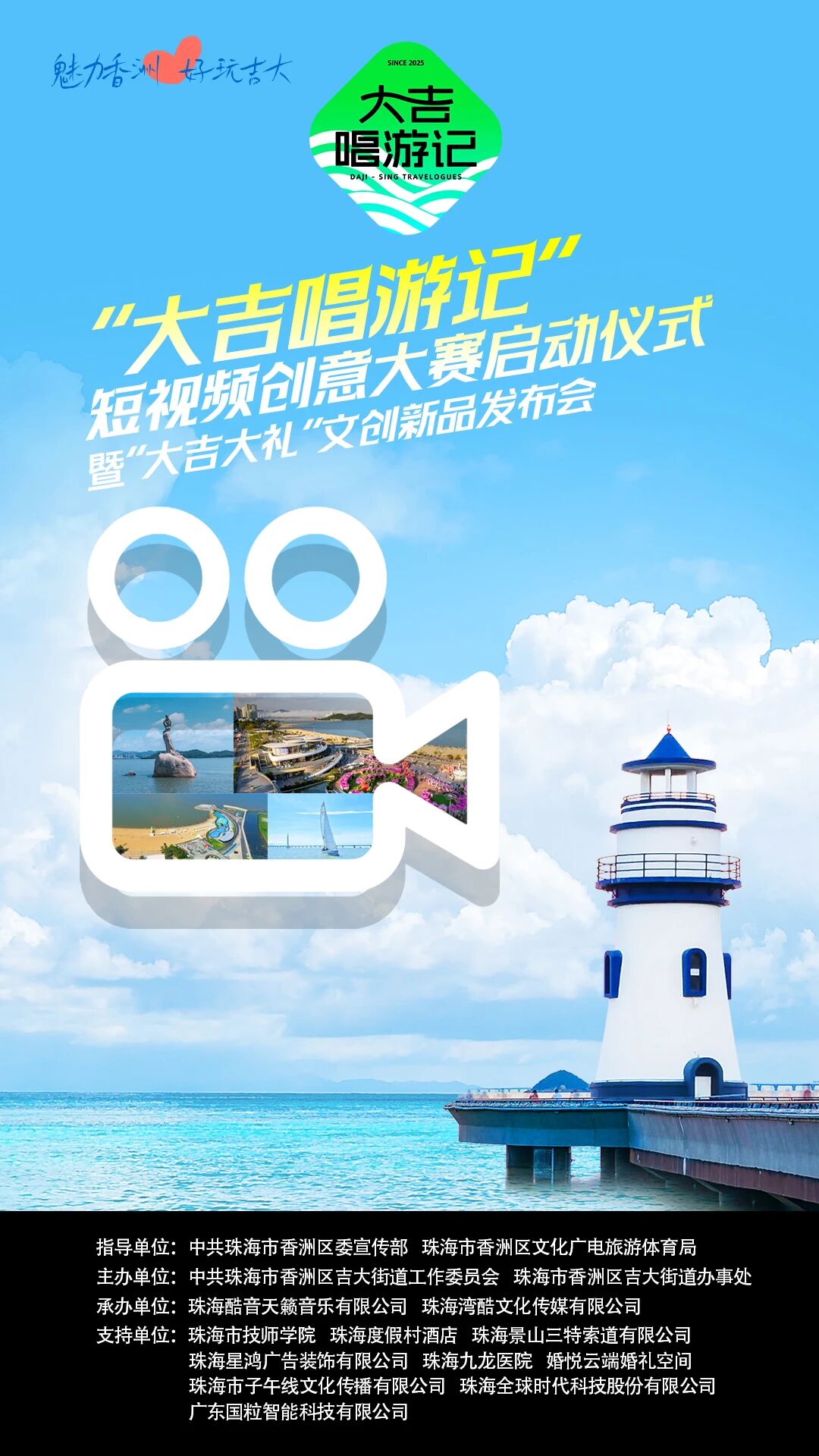 2025年9月28日下午,在香洲区委宣传部、区文化广电旅游体育局的指导下,由珠海市香洲区吉大街道党工委、办事处主办并联合多家支持单位共同打造的“大吉唱游记”短视频创意大赛启动仪式暨“大吉大礼”文创新品发布会在珠海度假村酒店隆重举行。本次活动旨在以“音乐+游历+视频”的创意形式,推动“魅力香洲·好玩吉大”文旅IP破圈传播,激发城市活力。