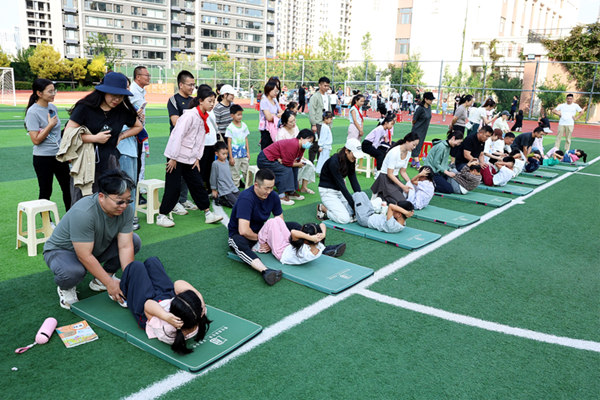 趣味比赛环节将现场气氛推向高潮,“亲子跳绳”、“亲子接力”、“亲子仰卧起坐”等一个个精心设计的项目,不仅考验着孩子们的速度与技巧,更考验着亲子间的默契与信任。赛场上,家长们全情投入,与孩子携手拼搏,用实际行动诠释着陪伴的力量;孩子们在奔跑、跳跃与合作中,尽情释放活力,体验运动之乐,身体素质和团队意识也得到了有效提升。掌声、加油声、欢笑声此起彼伏,汇聚成一首家校携手的动人乐章。