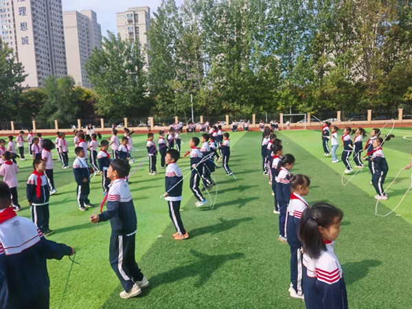 三年级的跳绳展示在操场上谱写着活力的乐章。翻飞的跳绳不仅锻炼了孩子们的体魄,更跳出了他们的自信与快乐,展现了三年级学生经过系统体育训练后日益增强的身体素质和协调能力,将整个展示活动的氛围推向了顶点。