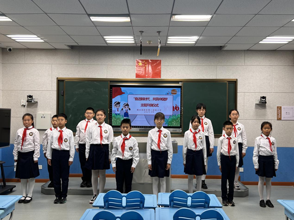 在“奋进新时代,共筑中国梦”主题升旗仪式中,学校五(4)中队少先队员代表担任主持,展现出新时代少年昂扬向上的精神风貌。
