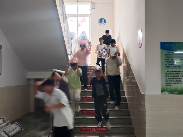 15:30分,校园警报突鸣,学生在老师的指挥下迅速蹲伏于课桌旁,或用书本护住头部,进行紧急避震。随着疏散指令发出,一千多名学生快速有序地从预定路线撤离教学楼到达指定区域,整个过程紧张而不慌乱,迅速而有条理,达到预期效果。集合后,各级部主任再次强调了应急逃生的严肃性,要求全体师生积极配合好每一次演练,不断增强应对突了事件的本领,同时又重点讲解了应对地震灾害的有效方法。