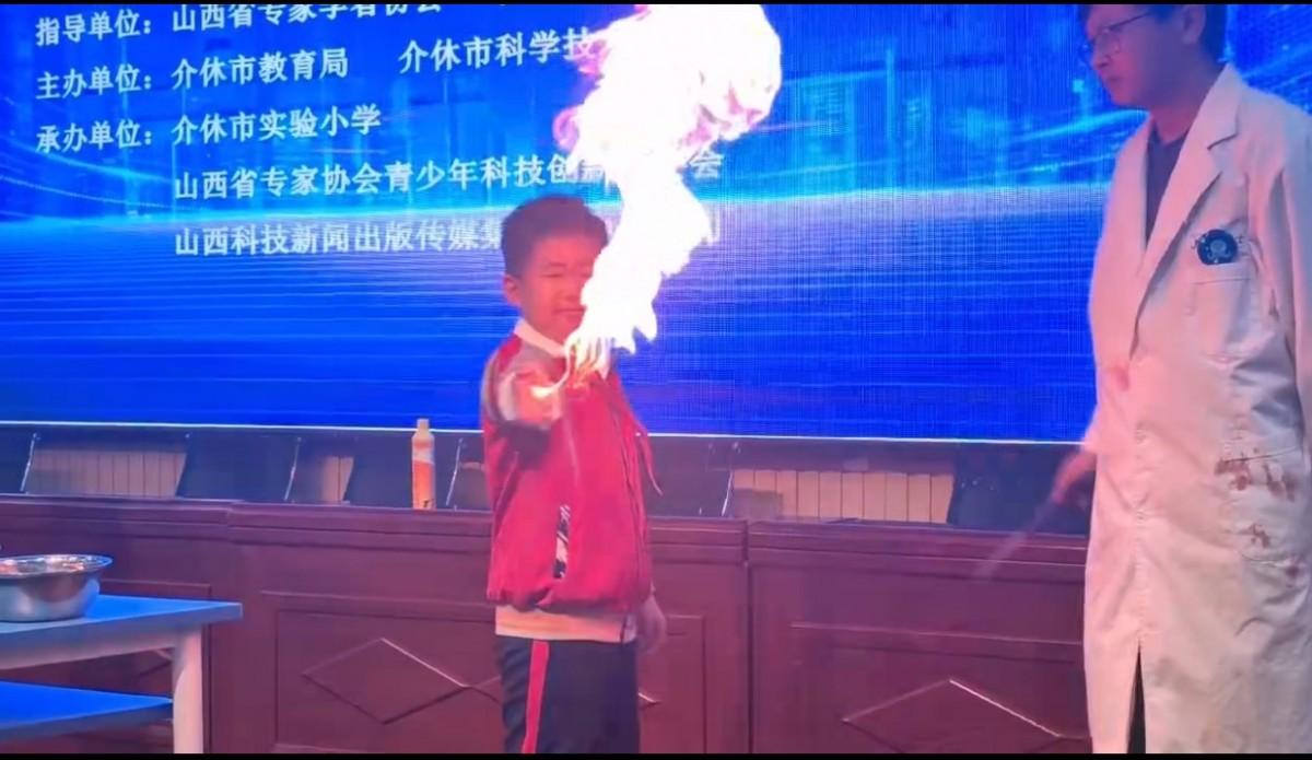 开幕式结束后,山西省专家学者协会青少年科技创新专委会的老师们轮番上阵,开启了一场别开生面的科学表演秀点燃全场热情。液氮蘑菇云实验中,白色雾气瞬间升腾如云朵般笼罩舞台,孩子们直观感受液氮汽化膨胀的“势不可挡”;“火焰掌”表演时,火苗在手掌上腾起奇幻光影;面粉爆炸实验通过模拟粉尘燃烧,清晰揭示能量转化的奥秘;马德堡半球实验让孩子们真切体会到大气压力的“威力”;角动量实验里,“稳如泰山”的陀螺更是将抽象的力学规律变得具象可感,深奥的科学原理在老师们的巧妙演示下,变成了看得见、摸得着的趣味体验,带领孩子们领略科技的神奇与未来的无限可能。