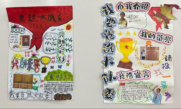 竞选活动启动后,队员们踊跃参与:从自主申报的真诚自荐,到班级海选中的民主推选,12位候选队员带着对服务的热忱脱颖而出。他们亲手设计的竞选海报,或手绘童真愿景,或排版巧思创意,一张张作品不仅是才华的缩影,更是“想为集体做些事”的真心写照,让教学楼展厅成了“责任与梦想的展示窗”。