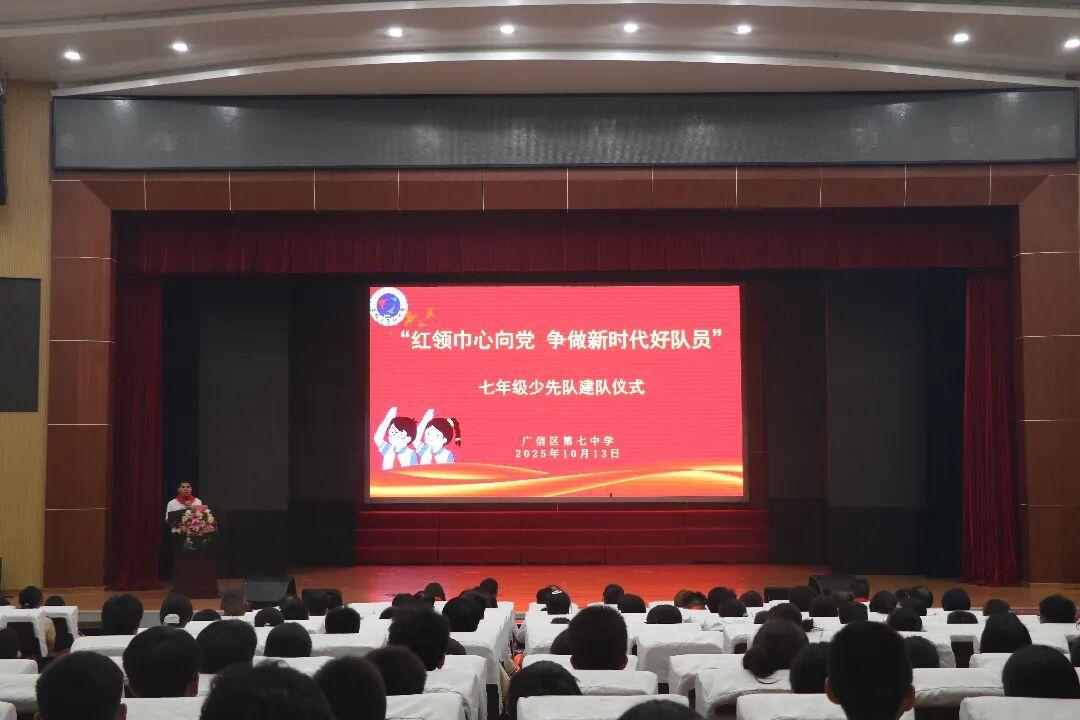 金秋送爽,队旗飘扬;誓言铮铮,童心向党。 为传承红色基因,筑牢青春信念,江西省上饶市广信区第七中学于2025年10月13日下午在多功能报告厅举行了以“红领巾心向党 争做新时代好队员”为主题的七年级少先队建队仪式。该校党委书记徐成祥、党委副书记童骏、德育副校长李天福、副校长曾怡等在家校领导、七年级各中队辅导员与少先队员代表共计320余人参加仪式,仪式由团委书记周睦忠主持。
