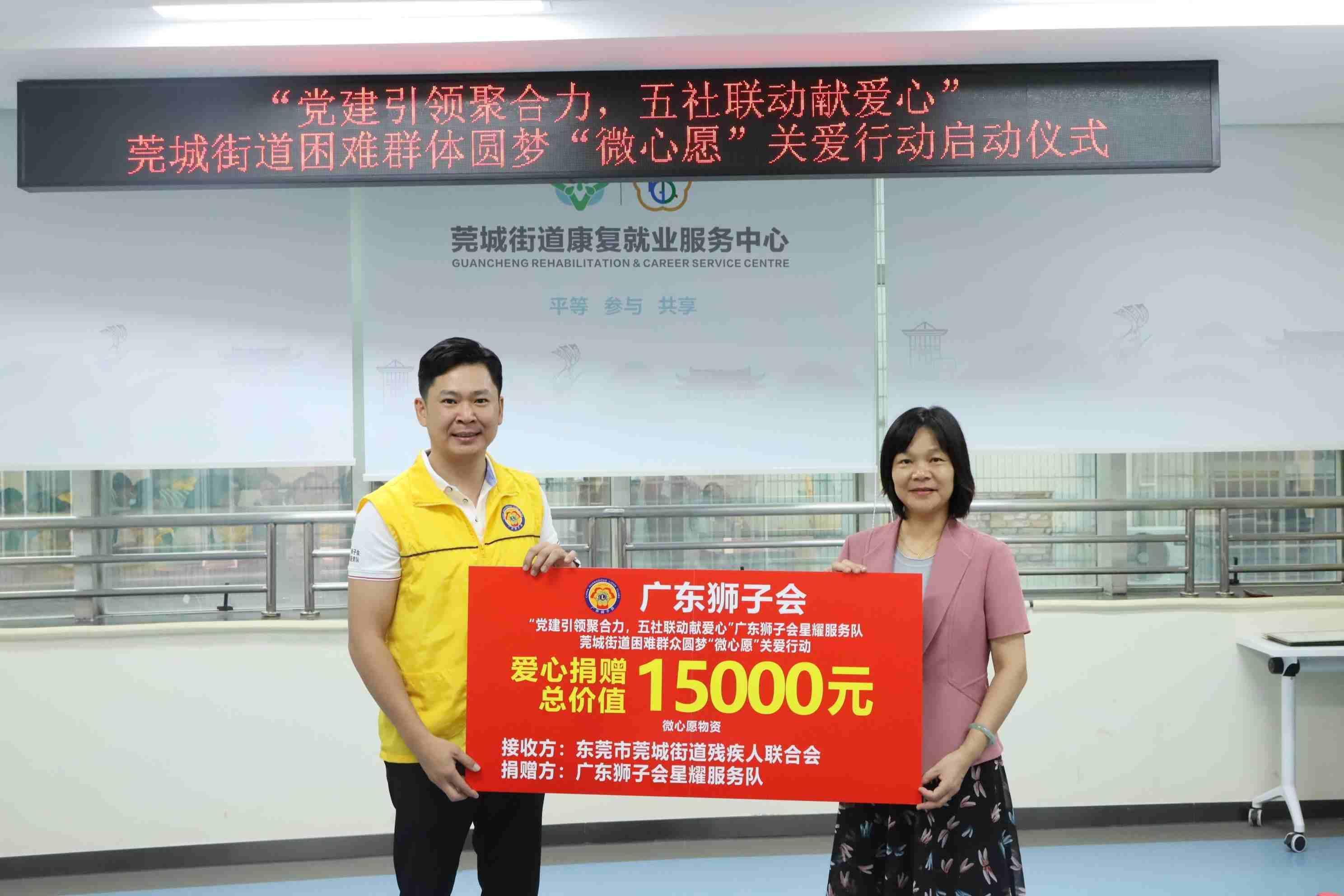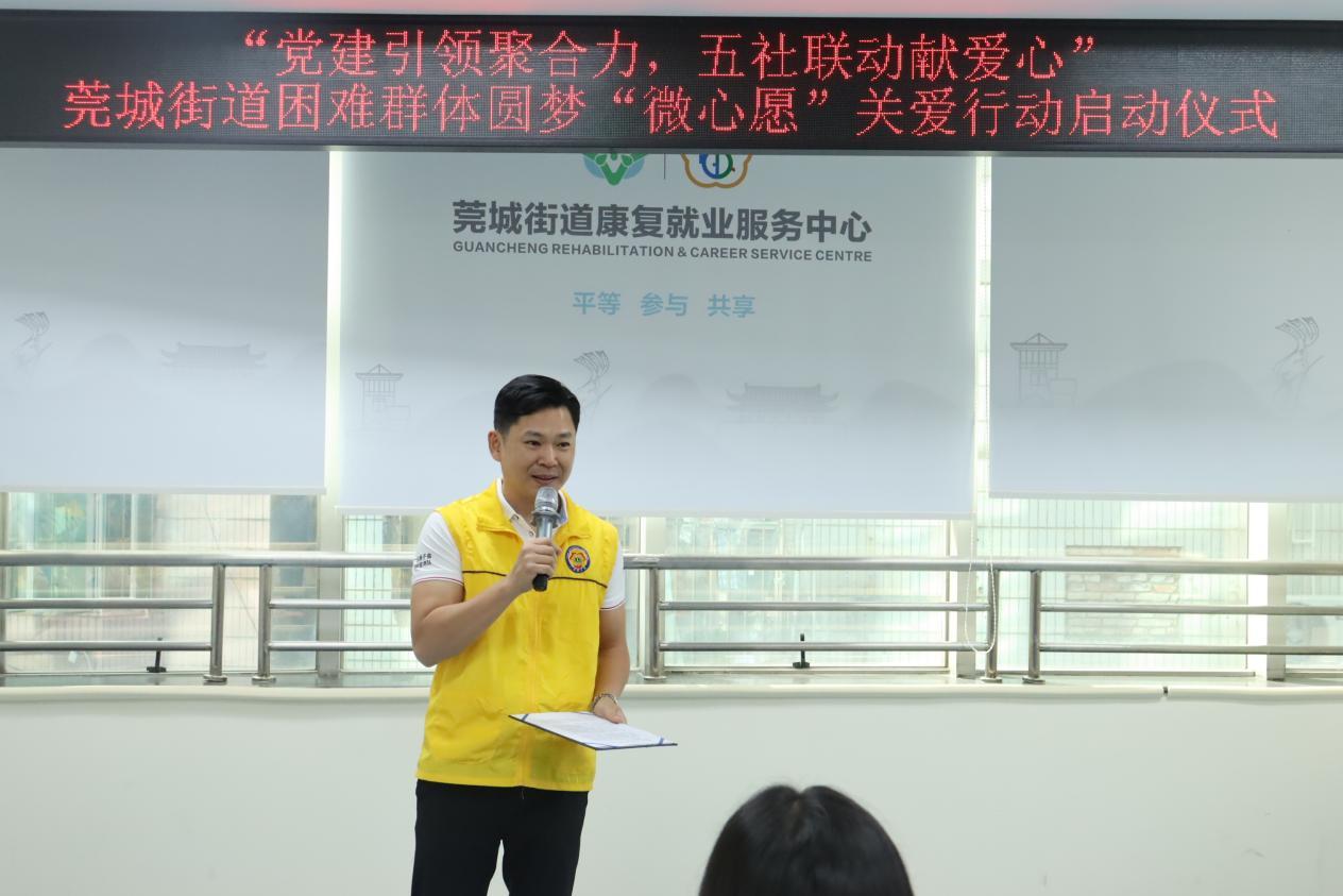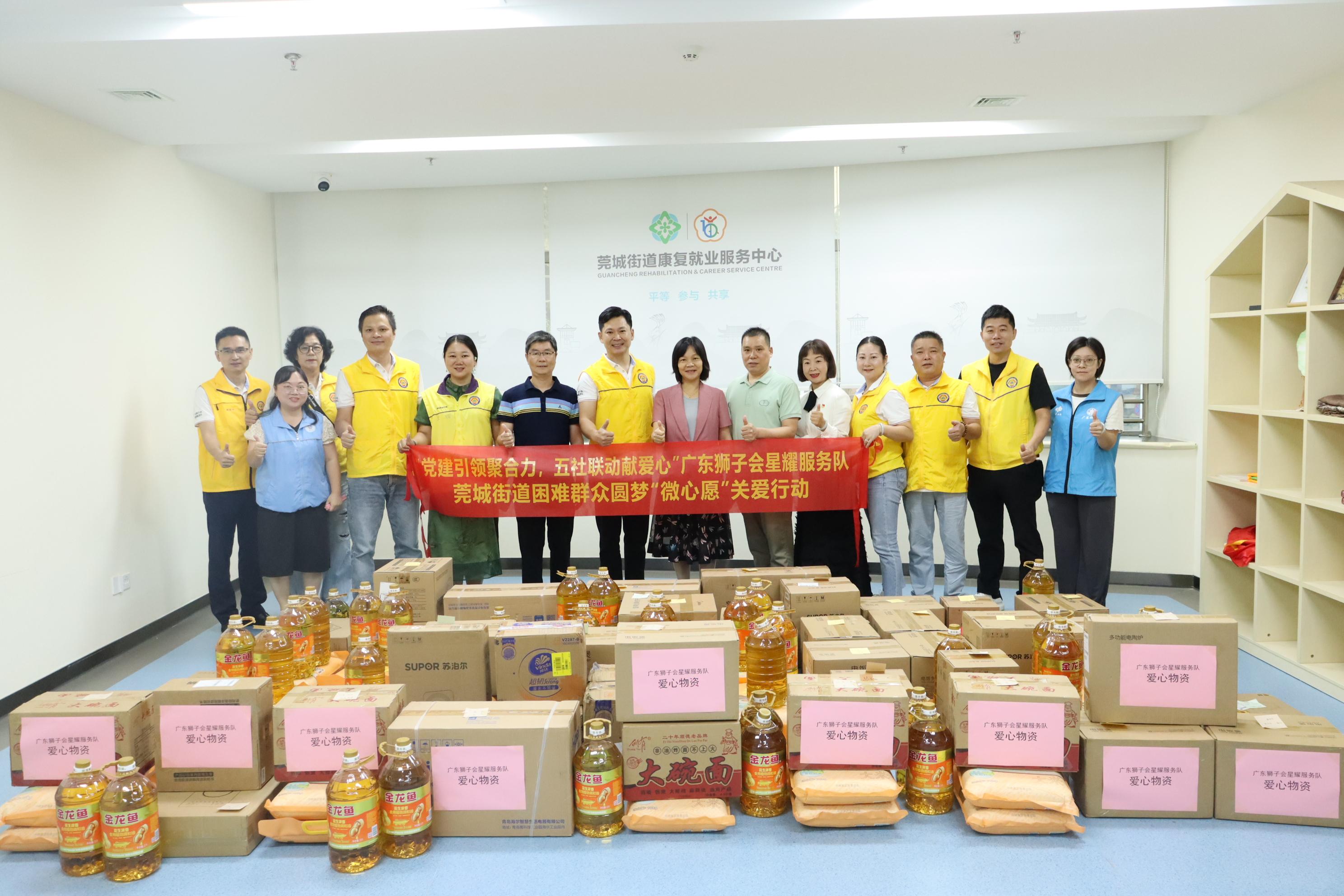 10月14日上午,由东莞市莞城街道公共服务办公室、莞城街道残疾人联合会、广东狮子会星耀服务队、东莞市正阳社会工作服务中心、华南亚太空间联合组织开展的“党建引领聚合力,五社联动献爱心”莞城街道困难群体圆梦“微心愿”关爱行动在莞城街道社区康园中心顺利开展,为莞城街道四十九户困难群众送去专属关怀,让这个秋日充满温暖与感动。