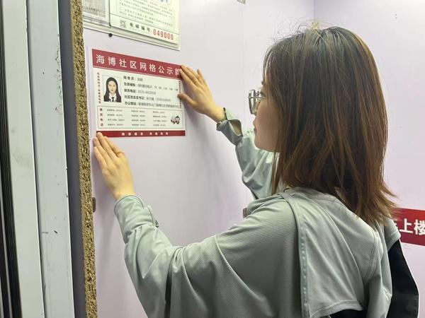 为打破居民诉求表达“最后一米”壁垒、减少重复投诉,海博社区在各小区单元电梯张贴“网格员公示牌”,标注网格员姓名、照片、24小时电话及负责楼栋,为每户居民配备“专属民生服务员”,构建“随时能联系、遇事有人管”的对接桥梁。