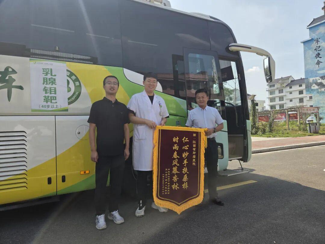 下塘乡党委副书记、乡长郑王剑与乡党委副书记舒涵向江西省肿瘤医院专家团队送上锦旗,感谢省肿瘤医院对下塘人民健康事业的大力支持和义诊专家团队两天来的辛苦付出。