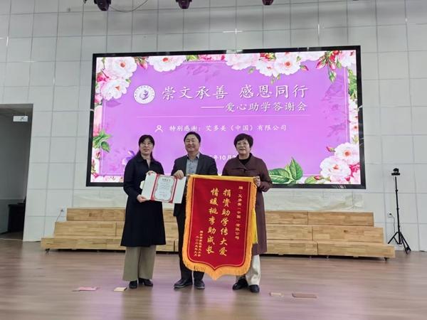 仪式高潮阶段,孙广娟副局长和张晓琳校长向各捐助单位赠与爱心助学捐赠证书和锦旗并合影。鲜红的锦旗、烫金的证书,既是对捐助单位善举的高度认可,更是社会与教育界携手育人的有力见证。