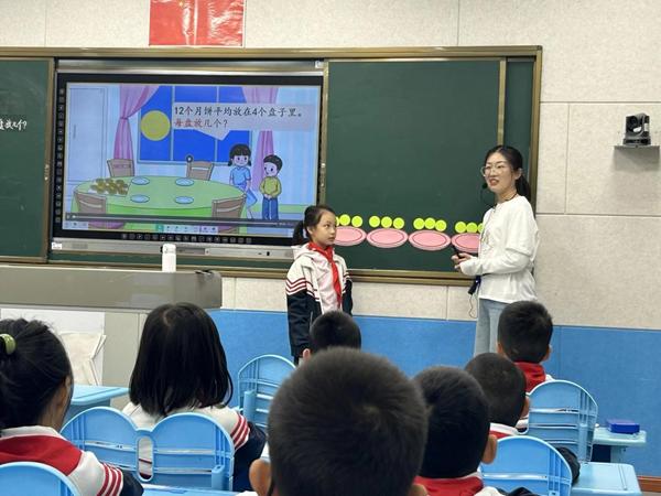 国文婷老师以中秋节为背景,通过分月饼的情境导入,复习了平均分概念后,深入探讨了除法的两种应用:已知总数和份数求每份数,以及已知总数和每份数求份数。课上通过学具操作、算式记录、对比分析等活动,学生理解了除法算式中各部分的名称及意义,认识了除号并学会了除法算式的读写,初步感知了除法 与平均分的紧密联系,为后续学习打下坚实基础。
