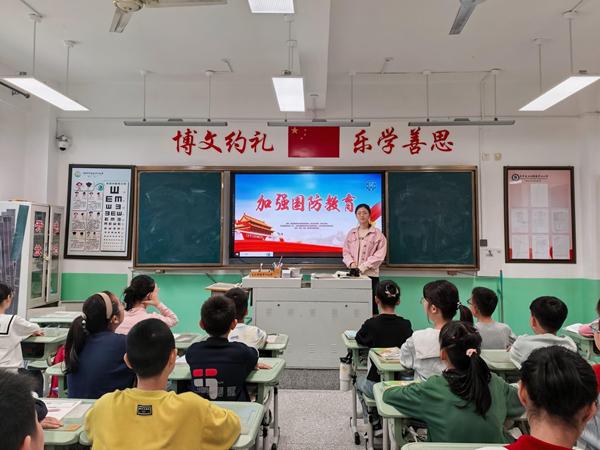 互动环节中,各班还设计了丰富的实践活动。有的班级开展 “国防知识抢答赛”,题目涵盖国防法规、军事常识、英雄人物事迹等内容,同学们举手抢答、气氛热烈,在比拼中掌握国防知识;有的班级组织 “我心中的国防” 小组讨论,大家结合生活实际分享感悟,“守护国防就是守护我们的校园和家庭”“长大要当一名军人,为国防事业贡献力量” 等真挚发言,展现出新时代少年的责任与抱负。