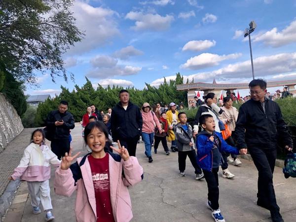 登山途中,一幕幕温馨的画面不断涌现。孩子们时而蹦跳着冲在前面,转身呼喊着“爸爸妈妈快点”;时而在陡峭处停下脚步,小心翼翼地牵住父母的手。家长们则耐心陪伴,时而鼓励,时而帮扶,不时用手机记录下孩子努力向上的身影。在一些略具挑战的坡段,家庭成员间默契协作,或你拉我一把,或并肩同行,“加油”“小心”的叮咛与鼓励声在山间回荡,亲情在共同的努力中悄然流淌。