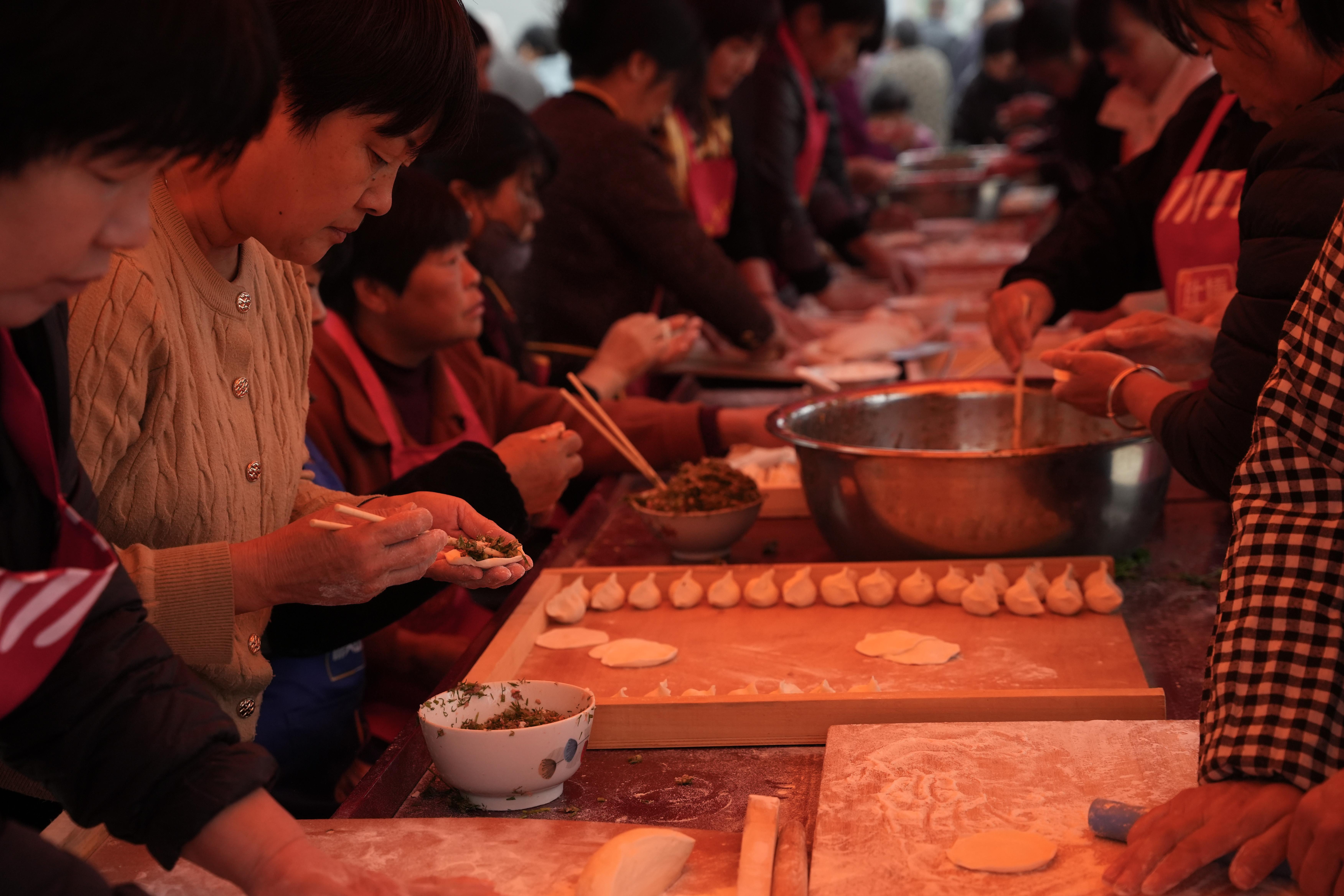 活动现场,40余名志愿者准时集结,有的擀皮、有的拌馅、有的捏饺子,指尖翻飞间,一个个饱满的饺子很快摆满了数十个托盘。与此同时,村委会还精心准备了老人喜爱的节目。戏曲、歌曲、秧歌舞轮番上演,老人们脸上个个洋溢着幸福的笑容。