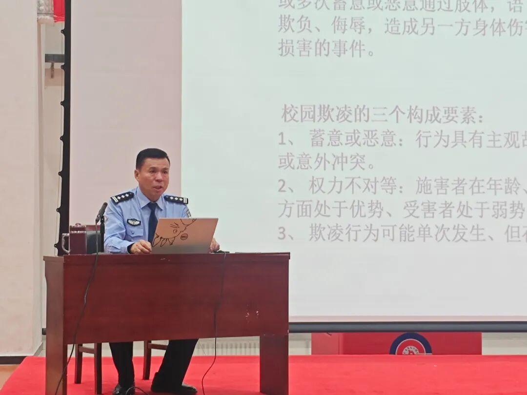 沧州市新华分局道东派出所副所长梁洪利应邀以热点案例为切入口,围绕“什么是校园欺凌”“校园欺凌的表现与危害”以及“如何防范和应对校园欺凌”等问题展开讲解,通过真实的案例,生动的语言,深入浅出地讲解了校园欺凌所带来的严重后果,让同学们深刻认识到“法不可违,纪不可松”,在每个同学心底筑起一道坚实的校园安全底线。