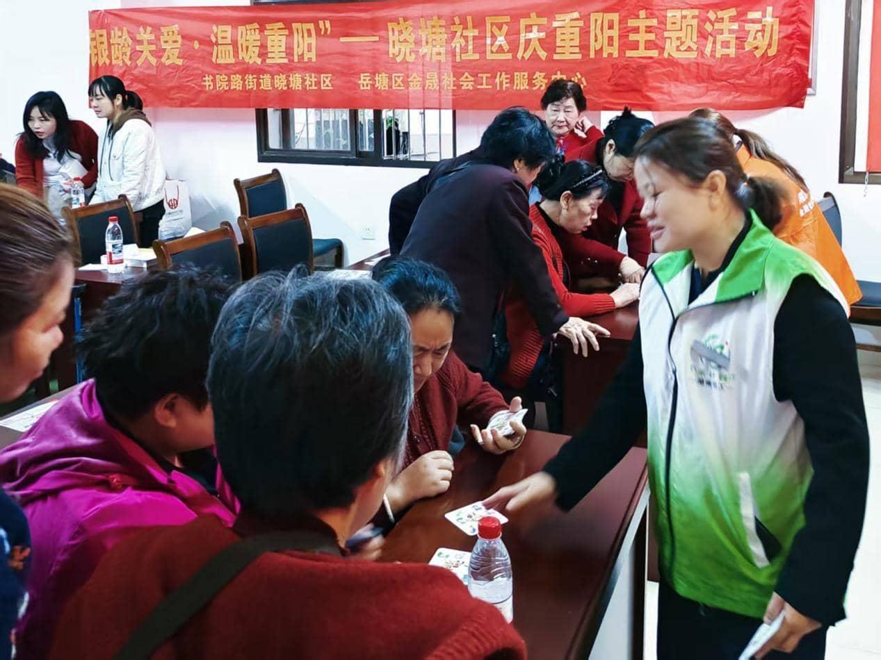 岁岁重阳暖人心,敬老爱老传美德。为进一步弘扬中华民族尊老、敬老、爱老的优秀传统习俗,10月29日上午,湖南省湘潭市岳塘区书院路街道晓塘社区党总支携手承办单位湘潭市岳塘区金晟社会工作服务中心,以“前期走访听需求、精心策划送服务”的创新模式,为辖区老年人精心打造了一场融合非遗手工制作与趣味答题互动的“银龄关爱・温暖重阳”主题敬老活动。