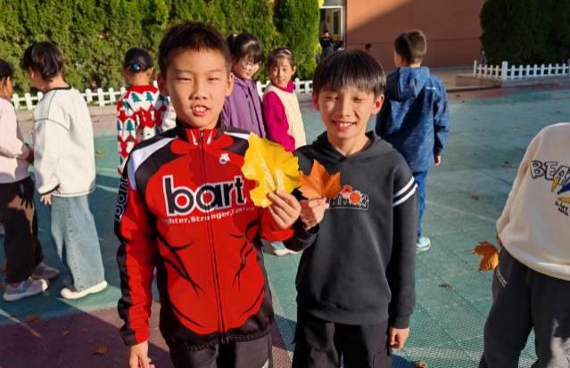 活动当日,阳光和煦,四年级的同学们在老师的带领下,兴致勃勃地走进熟悉的校园。他们的目光不再仅仅停留于教室与操场,而是专注地投向那一片片翩跹起舞、色彩斑斓的落叶。白杨叶灿黄如小扇,梧桐叶褐红似手掌,枫叶如火,松针铺地……孩子们小心翼翼地捡起这些大自然的信使,仔细端详它们的形状、颜色和纹理,不时发出惊喜的赞叹。有同学轻轻捧起一把落叶说:“看,这是秋天写给我们的信!”他们将形态各异的落叶视为秋天的独特语言,通过它们解读季节变换的密码。