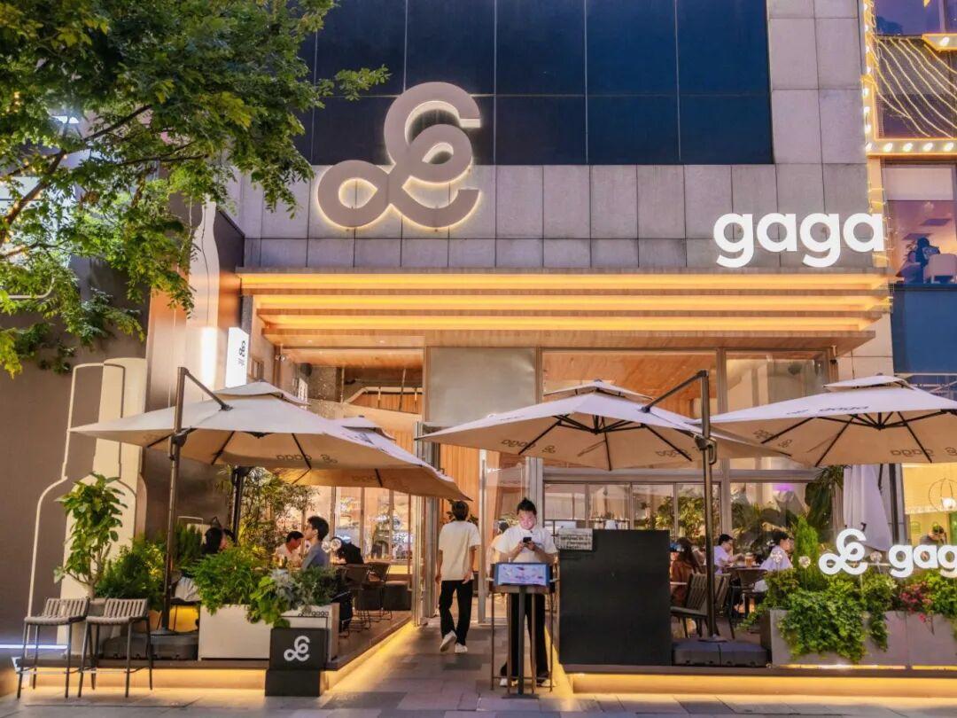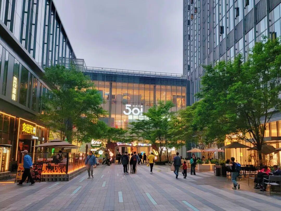 傍晚7时,万象城富春路外摆区渐入佳境。暮色漫过街角,Gaga的露天餐区被绿植缠绕的暖光灯串轻轻环抱,艺术装置的线条在光影中晕开柔润光泽;远处民心路外街的亮化灯带如流动星河,Fascino的面包香与轻食店的果香悄然交织。