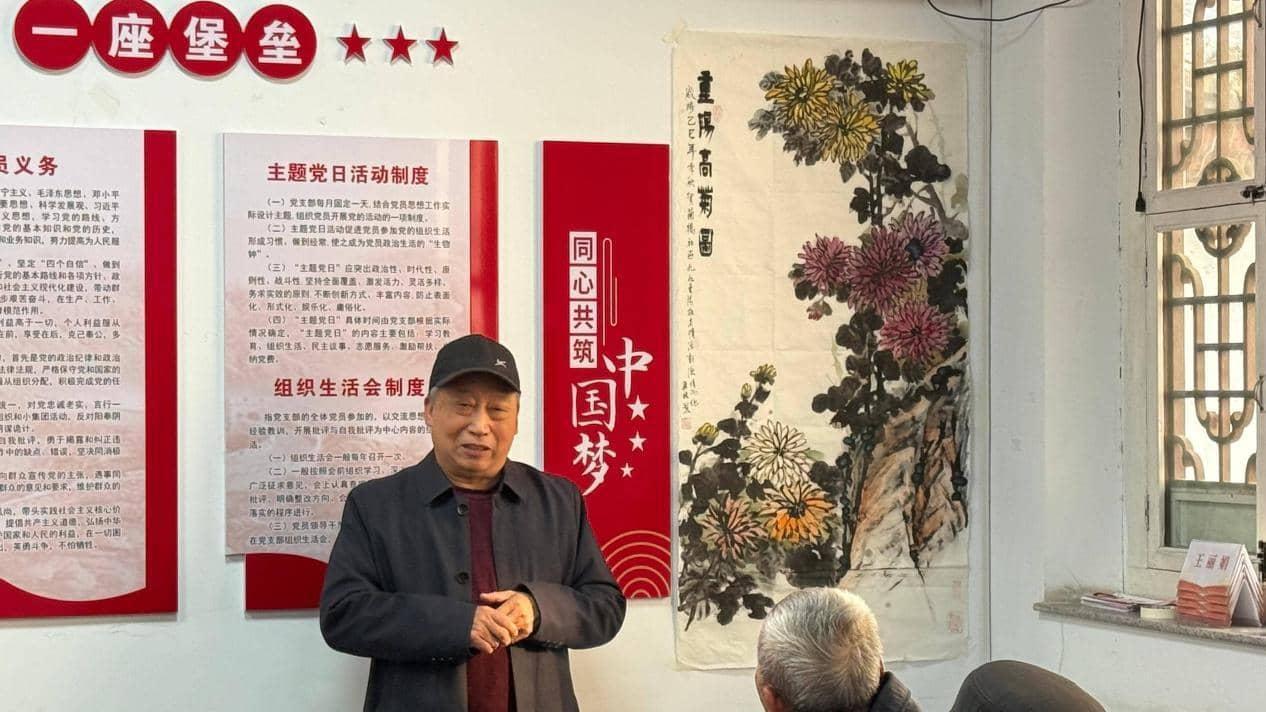 为进一步丰富长者精神文化生活,同时推动代际文化交流,活动设置备受瞩目的“书画赏析分享”环节。社区资深书画爱好者贾兴林老师带来了他为重阳节潜心创作的画作《重阳高菊图》。他不仅细致讲解了国画中菊花所象征的高洁长寿与坚韧品格,还分享了其笔墨运用、构图意趣以及画作背后蕴含的深深敬老情意。这一环节成功实现了长者对青年的“文化反哺”,让年轻一代感受到中华传统文化的魅力,更推动知识、技艺与情感在代际间的有效传承与双向流动。