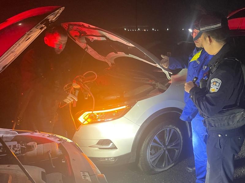 “师傅,是不是遇到难处了?”民警立即靠边停车,快步上前询问情况。经了解,王先生驾车途中突发左前轮爆胎,正当他尝试更换备胎时,因长时间开启车内用电设备,车辆电瓶意外馈电,不仅备胎没换好,车子也彻底无法启动。更让人着急的是,事发路段周边无任何维修站点,深夜难寻救援,王先生一时手足无措。