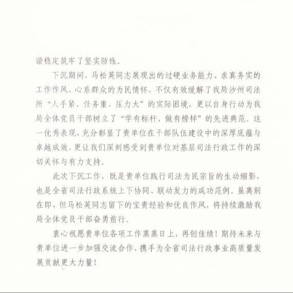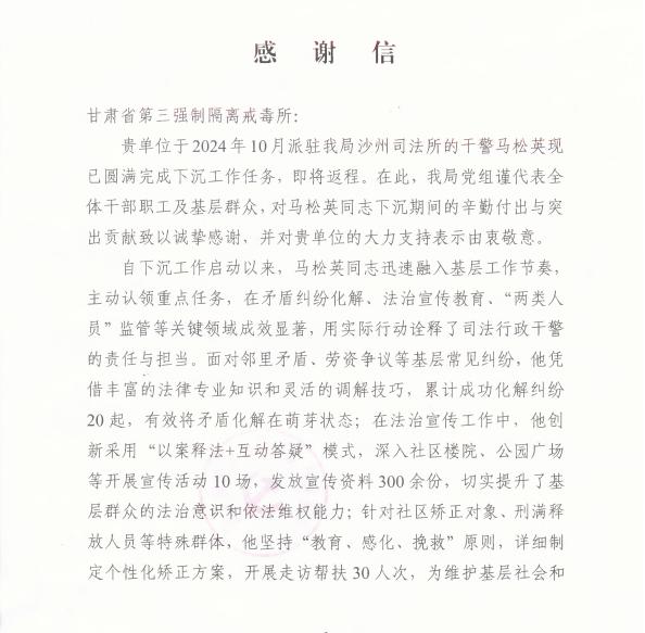 自支援基层基础工作以来,马松英迅速融入基层工作节奏,主动认领重点任务,在矛盾化解、法治宣传教育、“两类人员”监管等关键领域成效显著,用实际行动诠释了司法行政干警的责任与担当。敦煌市司法局特意送来感谢信,对马松英在支援基层基础工作的辛勤付出和突出贡献给予了充分肯定。