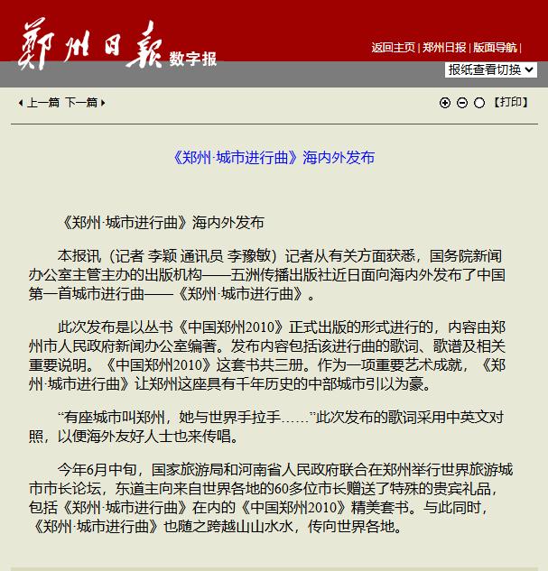 中国第一首城市进行曲被正式载入史册被称作当代“史书”和“史册”的《郑州年鉴》,将独具特色的中国第一首城市进行曲,即《郑州—城市进行曲》(又称《有座城市叫郑州》),正式载入最新出版的2010年度最新版本。