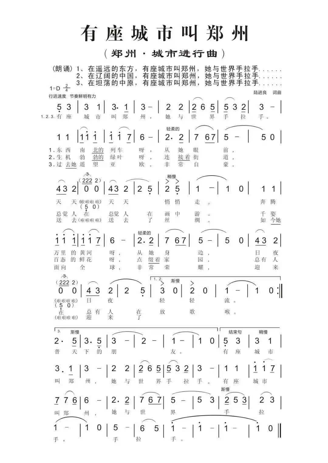 郑州市词曲作者陆进良创作的音乐作品《有座城市叫郑州》(又名《郑州·城市进行曲》)在中国大众音乐协会主办的“感动中国全国第三届原创歌曲、歌词选拔活动”暨“感动中国成就经典-献给建国60周年原创词曲大赛”中荣获优秀奖,该作品被河南省图书馆永久收藏。