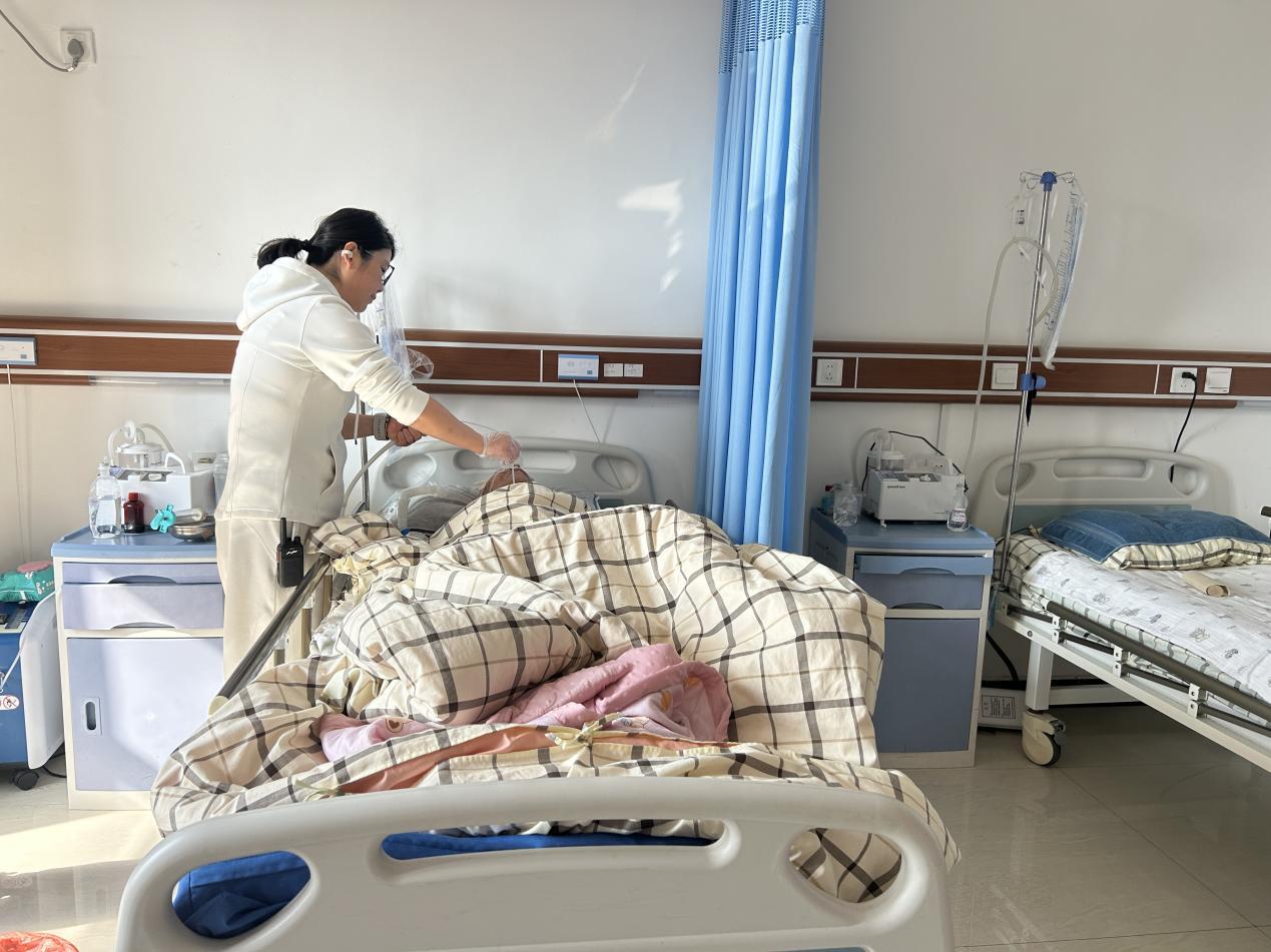 为了随时观察老人的病情变化,程婷干脆在老人的病床边支起了临时的“床铺”,开启了三天两夜的守床模式。白天,她为老人擦拭身体、喂水喂饭、按摩四肢,防止长时间卧床导致肌肉萎缩;夜晚,她每隔一小时就起身查看老人的呼吸、体温和气切处情况,随时清理分泌物。期间,老人因为身体不适情绪烦躁,常常哭闹着不配合护理,程婷就坐在床边,握着老人的手给她讲村里的新鲜事,唱老人爱听的老歌,直到老人平静下来安然入睡。