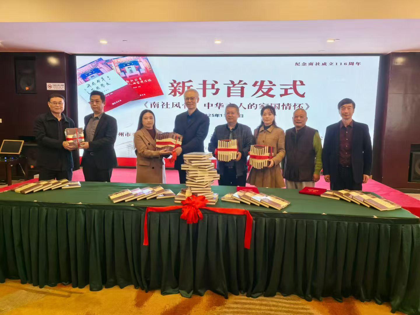 2025年11月13日,在纪念南社成立116周年之际,《南社风骨:中华文人的家国情怀》新书首发式在江苏泰州举行。这本27万多字、近40篇文章的《南社风骨:中华文人的家国情怀》新书,日前由国家级出版机构线装书局出版。《南社风骨:中华文人的家国情怀》在中华南社学坛、江苏省南社研究会和泰州文联指导下,泰州南社文化促进会通力合作,泰州军分区原政委、泰州南社文化促进会原会长庄义春历经八年时间主编并自费出版而成。该书史料详实,内容丰富,文辞精美,口吻毕肖,装帧惊艳,篇篇华章,具有红色史学和历史传承的重要意义。泰州市政协副主席、泰州民革主委周国翠和来自北京、天津、上海、南京、苏州、嘉兴、昆明、南通、扬州等地的数十位南社、辛亥、黄埔后裔和南社历史文化研究专家出席了首发式。