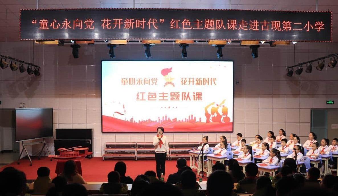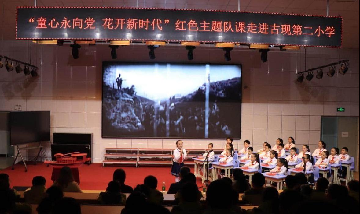为厚植少年儿童爱国爱党情怀,传承红色基因,11月14日,烟台市青少年宫“童心永向党 花开新时代”红色主题队课巡演活动走进黄渤海新区古现第二小学。