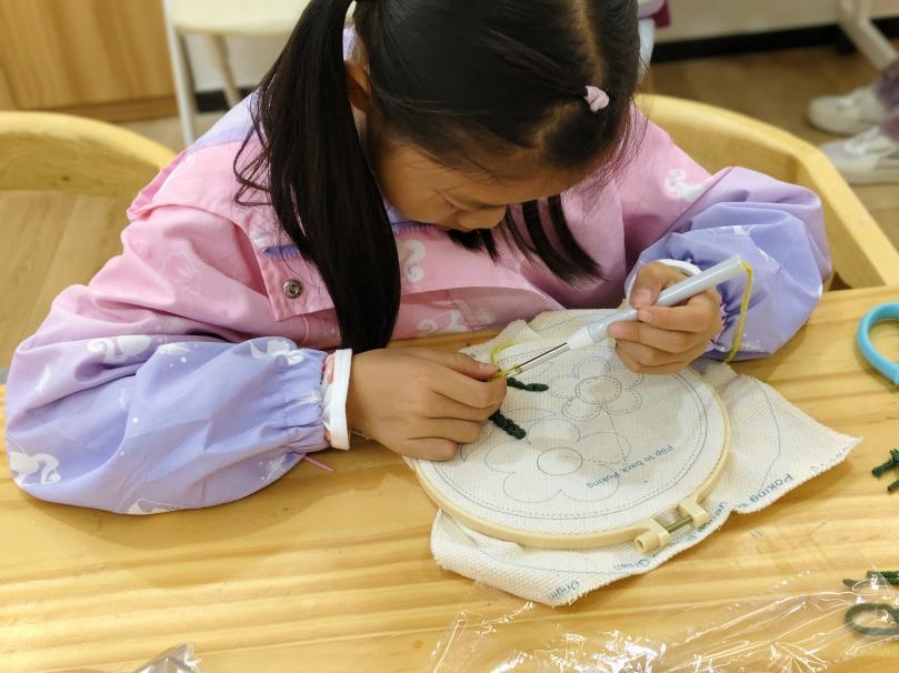 与传统的刺绣不同,本次活动引入了新颖有趣的戳戳绣工艺,让居民们通过特制的针具和布料,在轻松愉快的氛围中体验手工创作的乐趣。活动现场,色彩斑斓的毛线、各式各样的戳针以及精心准备的图案模板,共同构成了一个充满创意与想象的空间。在专业老师的指导下,居民们纷纷化身“创意大师”,用指尖的跃动在布料上“戳”出一幅幅独一无二的作品。有的居民精心“戳”制了可爱的卡通形象,有的则巧妙融合了自然元素,创作出别具一格的艺术品。这场活动不仅激发了居民们的创造力和想象力,更在互动交流中促进了邻里间的情感联结,为社区文化生活注入了新的活力。