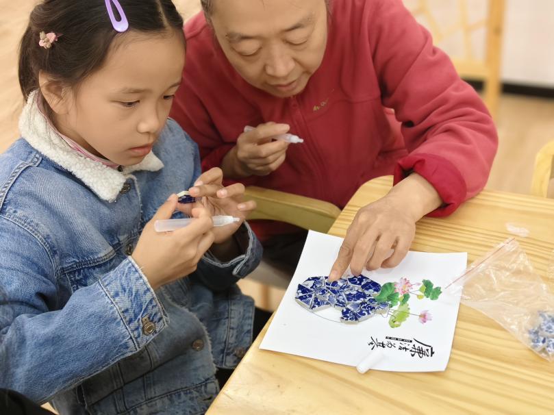 通过讲解青花瓷的历史渊源、纹样寓意以及手工制作的基本流程,居民们对青花瓷这一中华文化瑰宝有了初步而深刻的认识。在手工制作环节,居民们面对各式青花瓷贴片,起初或许有些生疏,但在红管志愿者的手把手指导下,大家逐渐找到了创作的灵感与节奏。志愿者们鼓励居民大胆创作,即使贴片间有缝隙也无妨,重要的是享受这一创作过程。居民们纷纷发挥自己的想象力,将青花瓷贴片巧妙组合,创作出一件件独一无二的作品,不仅体验了手工创作的乐趣,更在互动中加深了对传统文化的理解与热爱。