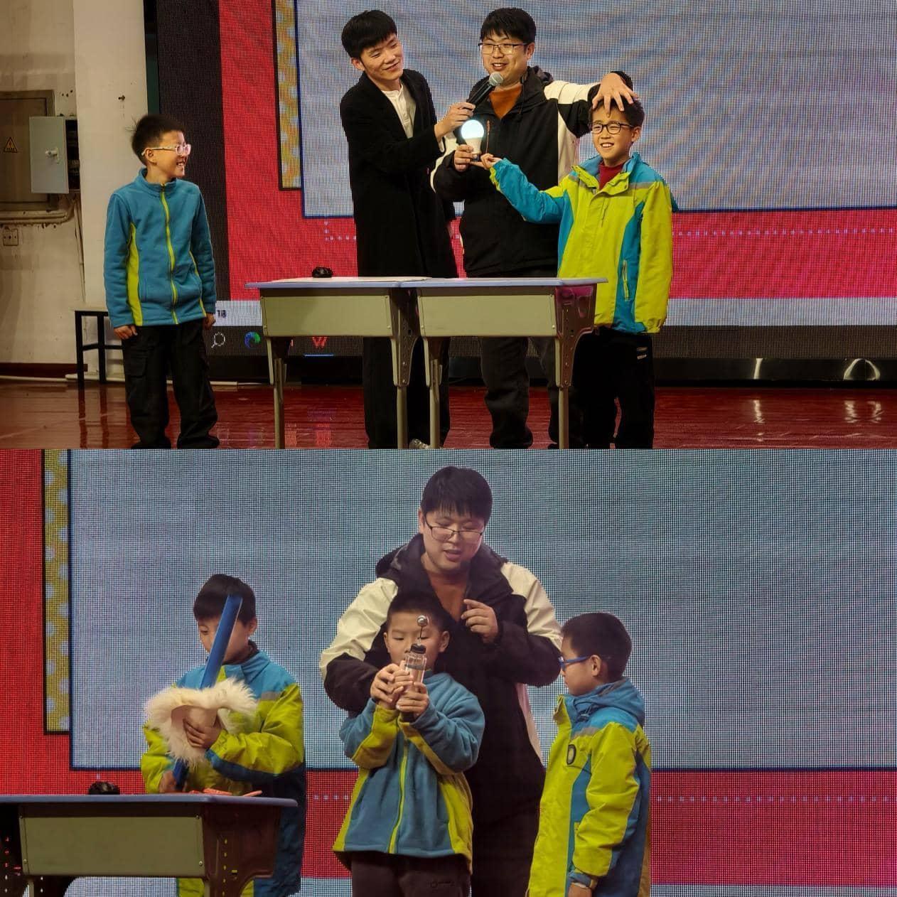 实验演示结束后,沉浸式互动体验与科创制作环节同步开启。同学们既踊跃登台,亲手操作无线输电、气流托举等实验装置,直观感受科学现象的奇妙,四年级的刘明哲兴奋地说:“冬天里动手做实验太有意思了!当魔灯在我手里亮起时,感觉自己充满了探索的力量,以后我要更爱科学!”。