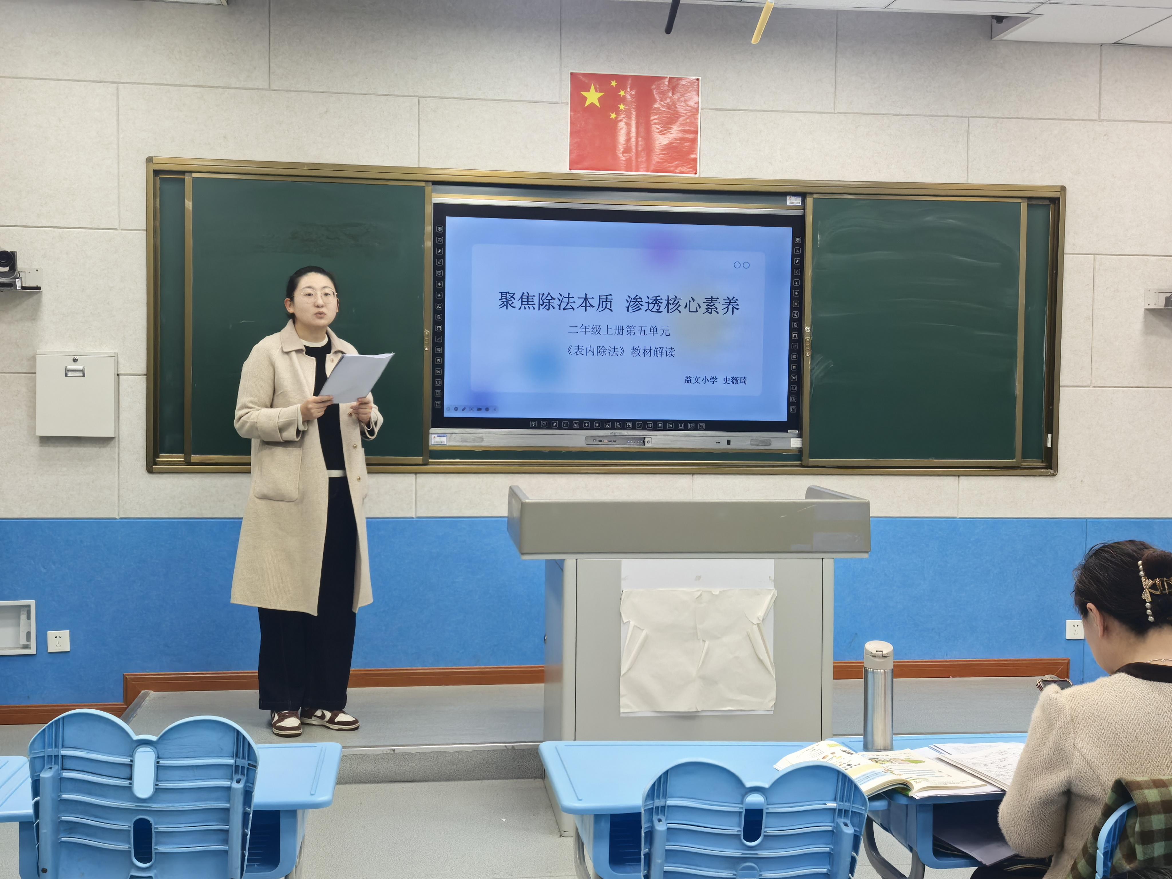 最后,张主任围绕单元教学的核心环节做了清晰梳理:首先在单元内容定位上,要明确单元的承上启下作用,聚焦除法意义、数量关系等核心内容,同时需严格把控教学边界、避免超纲;在单元教学实施层面,建议以素养落实为导向、关注学生差异,多让学生动手操作、开口表达,主题活动要适度开展,服务于综合与实践的目标,同样需规避超纲问题;而在教学评价环节,可结合过程性评价、实践类作业、单元测评与情境辨析等方式,最终希望教学能走向“清晰、安静、灵动、厚重、有张力”的状态,让学生在学习中收获感动、思考、思辨与成长。