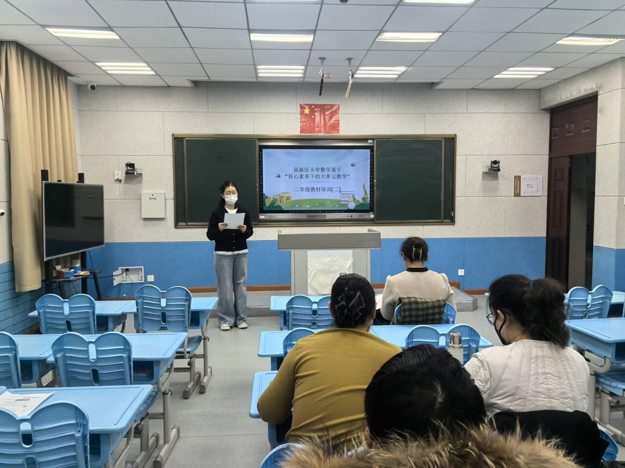 本次培训内容为新教材的后四个单元,分别由实验小学国文婷老师、益文小学史薇琦老师、益文小学于佳卉老师、崇文小学钟红红老师进行解读,区二年级全体数学教师参加。