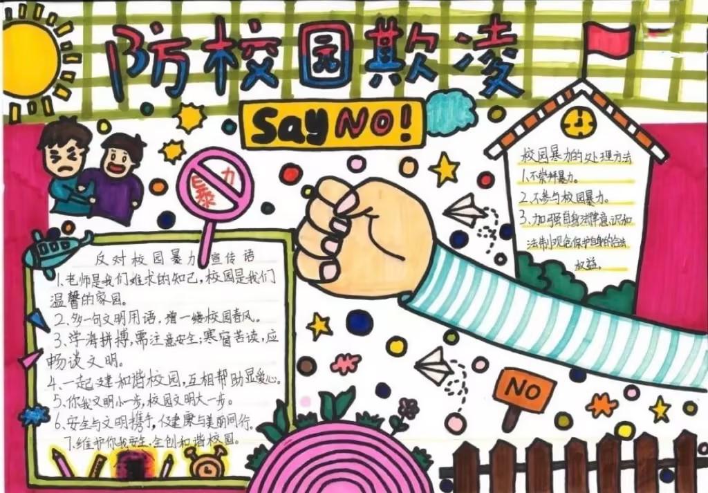 接下来同学们以预防校园欺凌为主题,绘制了防欺凌手抄报。其中,栩栩如生的绘画,刚劲有力的文字表达出同学们对安全校园的憧憬,以及对校园欺凌行为的坚决抵制!